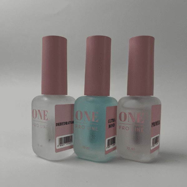 Carry out the standard preparation of the nail: remove the previous coating remove the cuticle buff the surface and give the desired shape to the nails. Clean the nail plate with NAIL PREP ONE PRO LINE disinfectant and degreaser. Apply DEHYDRATOR ONE PRO LINE to the nail plate. Let it dry for 20-30 seconds. in the air Apply ULTRA BOND ONE PRO LINE or PRIMER ONE PRO LINE depending on which will be the next base or gel coating avoiding getting the liquid on the cuticle and lateral ridges. It dries in 20-30 seconds. in the air Continue the coverage with the method you are used to.