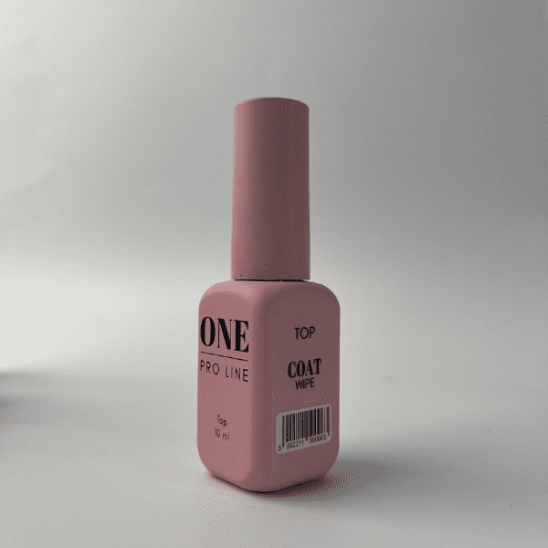TOP COAT WIPE ONE PRO LINE is a top of medium consistency with a glossy finish and a sticky layer that allows you to complete the manicure with a design (sequins, glitter, sliders). Densely covers the color layer, evenly distributed over the nail, does not bleed. Protects the coating from external factors during the entire sock, does not turn yellow.